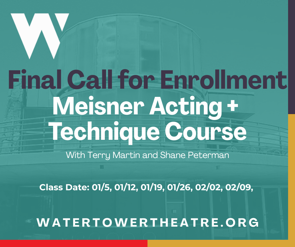 WaterTower Theatre is continuing with another session of the Sanford Meisner Acting Technique this winter. This acclaimed, systematic method will equip actors with reliable tools and skills to confidently prepare for any performance. The class is led by distinguished Meisner teacher Terry Martin and WTT Producing Artistic Director Shane Peterman, who together bring over 40 years of teaching expertise. Their focus will be on Preparation, Personalization, and Interpretation - endowing you with the vital tools for healthy emotional investment in your work, understanding the author's intention, and making performance pieces your own. We'll cover repetition techniques, given circumstances, monologues, and scene work — all while utilizing this classic technique.
